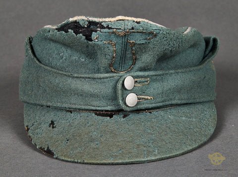 Very Salty Army Private Purchase Model 1943 Officer Cap, Named-This is a super salty veteran that has had the one piece, t-type insignia removed. There are many holes and areas of wear with missing material It is an officer cap with silver mesh piping around the top panel It is produced in very soft doe skin field grey wool. There are a pair of silver finished pebbled metal buttons at the front. The interior is fully lined in goldish grey rayon. It is clean and has minor wear. There is a moisture shield with maker info. There is a tag affixed to the interior with the name, rank and unit info of the owner. The name and rank are Obfhr. Thomüller (oberfuhrer). There is an ersatz leather sweatband that is fully intact. A good resto project!