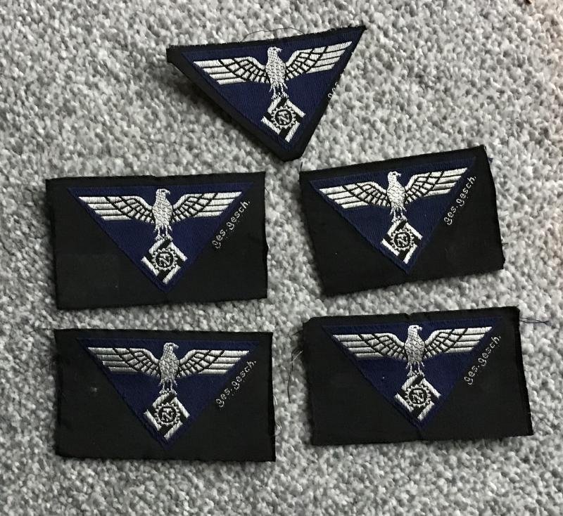 TENO overseas cap insignia having a stylised machine woven eagle, in silver/aluminium thread on a dark blue cloth. 70 by 45mm. Unissued and marked 'Ges. Gesch'.Mint condition, 5 available.Priced EACH