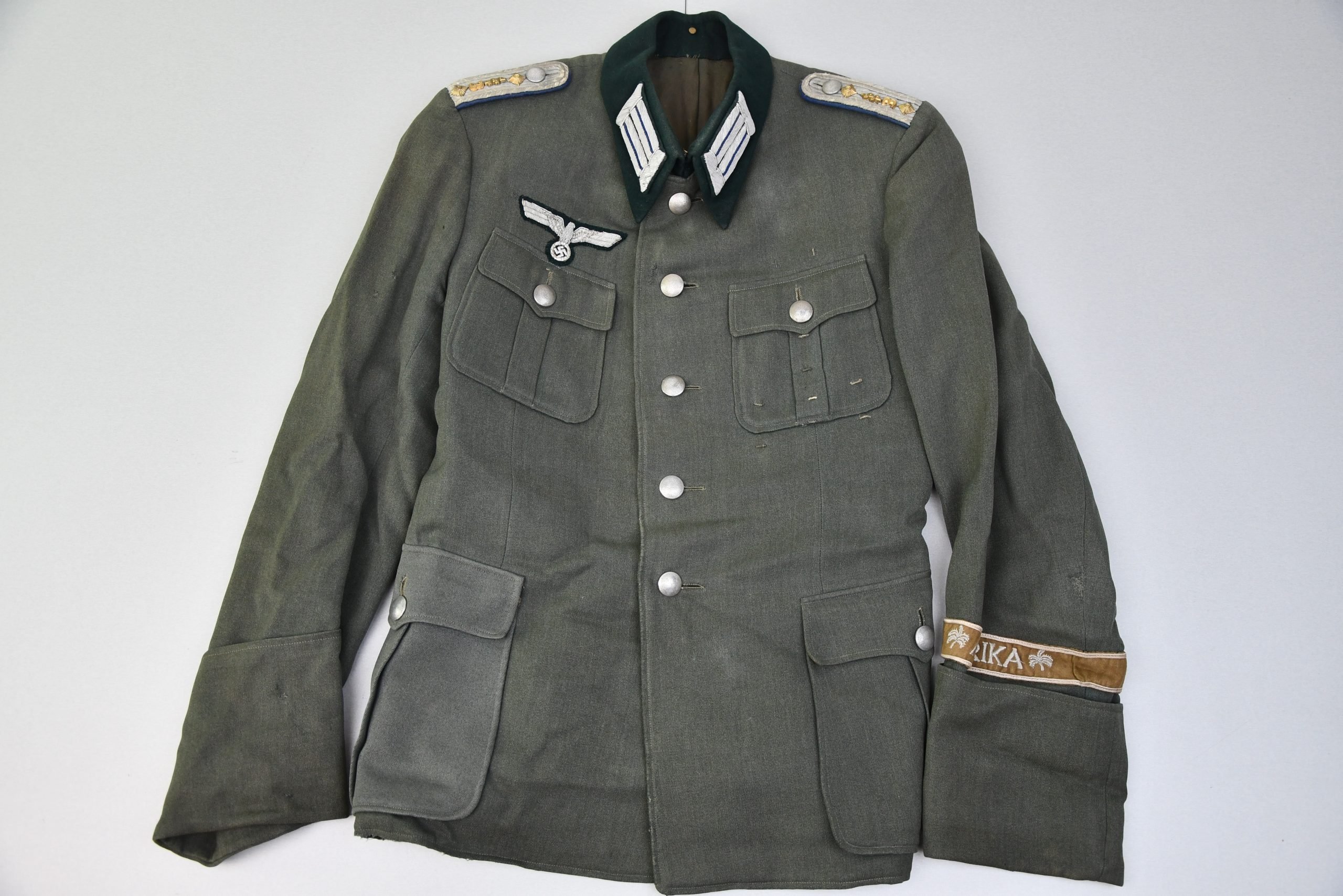 Very attractive M36 pattern officer's tailored field blouse, issued to a medical officer (Hauptarzt) with the rank of Hauptmann. This tunic is a fine example of a privately tailored wartime piece and remains complete with its original, period-applied insignia.The collar tabs and shoulder boards feature dark blue Waffenfarbe, correctly denoting the medical branch. An original Afrika campaign cuff title is still applied to the sleeve, adding strong historical and display value.The blouse is of a good, wearable size and shows honest wartime wear, including a few period field repairs, which only enhance its authenticity and combat history. There are no major damages or structural issues.One pocket is manufactured in a slightly different shade of field-grey cloth, yet is original to the tunic. This variation is fully consistent with wartime production and material shortages, and does not represent a later replacement.The tunic displays numerous medal/award loops, making it an excellent candidate for a complete and attractive display or mannequin setup with many awards.Overall, this is a highly desirable and original M36 officer's tunic, with Africa campaign history, and excellent visual appeal, a centerpiece item for any advanced WWII German militaria collection.
