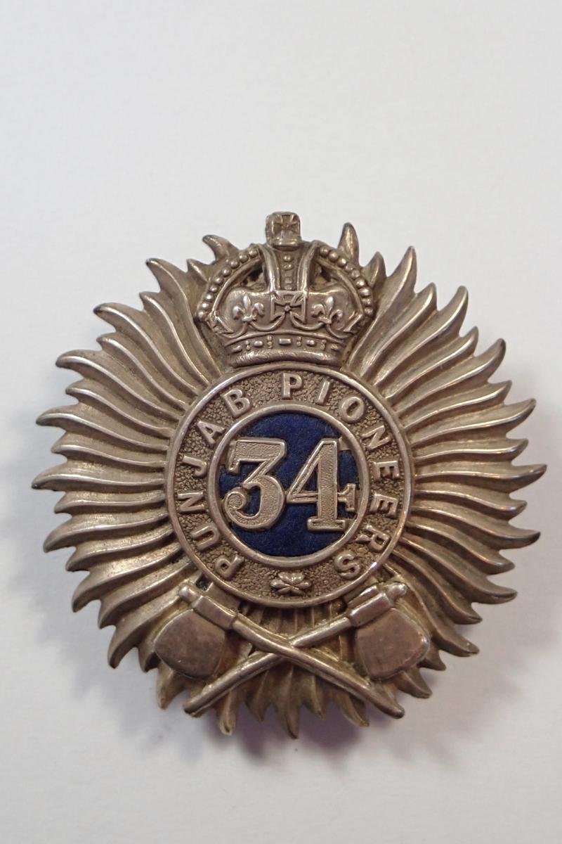 Made from white silvered metal and blue velvet and in very good condition, in use from 1901 until 1903 only when they became the 34th Sikh Pioneers. Measures 58mm high.