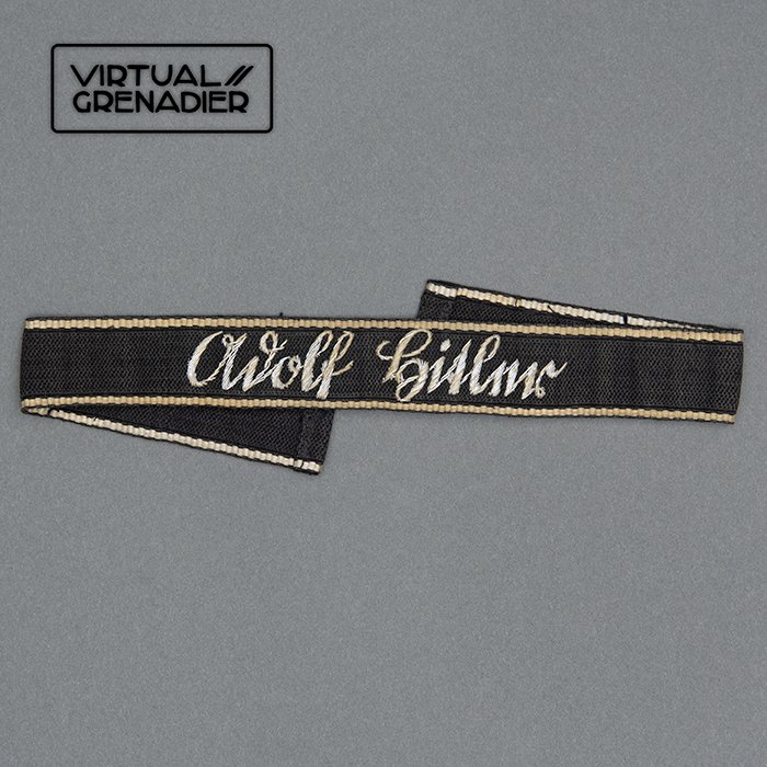 Extremely rare early to mid '30s hand embroidered wire SS Leibstandarte Adolf Hitler sleeve band, the lettering is embroidered by hand in aluminum wires on on RZM pattern band having ten strand white cotton thread borders, the band is 40cm in length and the ends are finished with machine sewing, it had been hand sewn to a uniform with one end overlapping the other and black cotton attachment threads may still be observed, showing wear to the embroidery plus soiling and age to the borders, the band is absent border nicks or other defects, USD $6750