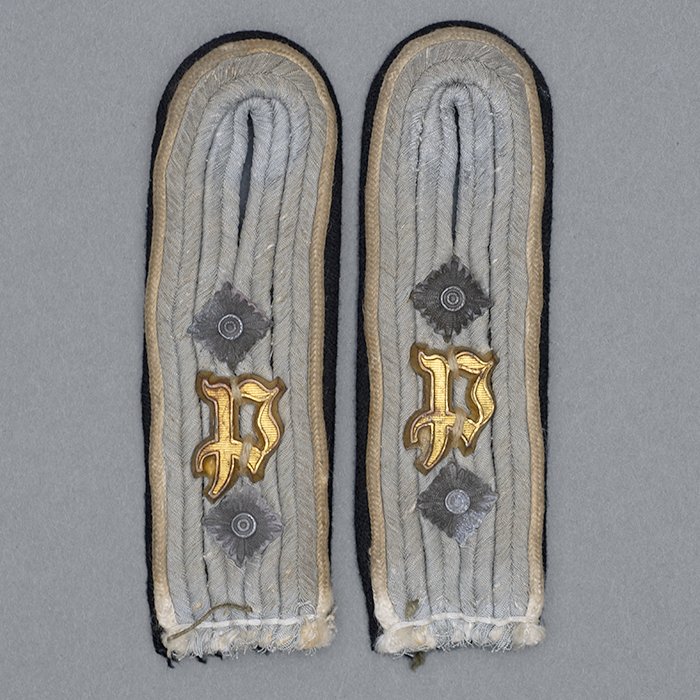 Matched pair of sewn in shoulder boards for a Waffen-SS Panzerjäger Hauptsturmführer, it is thought that these boards may have been worn by an antitank officer as part of a small Panzerjäger detachment within an Infanterie Regiment, the large gilt finished gothic P devices are originally applied with white cotton thread, each board has two small zinc rank pips of the type with edge prongs, the boards' subdued metallic cords and thick basketweave style of rayon piping are sewn to a black wool base having inner card and wire stiffeners, showing wear, age and soling, the rank pips have traces of oxidation, a couple of attachment threads from when the boards were removed from the shoulder seams are still in place, the pair are textbook Waffen-SS officer shoulder boards with an interesting original addition, USD $1500