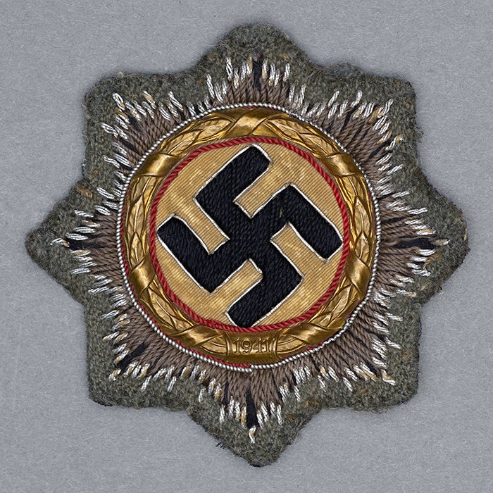 Uniform removed cloth German Cross in Gold, having hand embroidery in aluminum, black and red threads on a field grey colored wool base, with a gilt metal wreath, showing age, soiling and with remnants of the original attachment threads, only remnants of the black backing paper remain, very appealing, USD $825