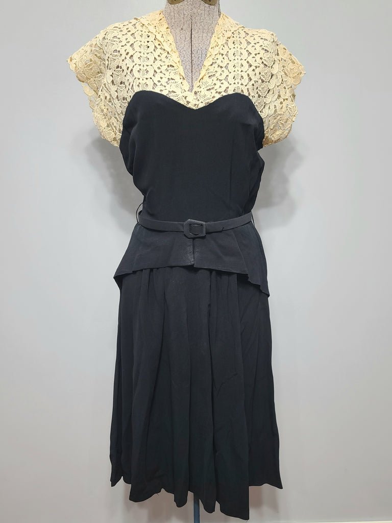 Vintage 1930s / 1940s black rayon dress with lace top.MEASUREMENTS (approximate):Bust- 34'Waist- 27'Hips- 37'Length- 41 3/4'Nice peplum. Comes with a belt, but the belt is a slightly different material. The lace is an off-white / cream color. Some discoloration on the lace - especially around the neck and a little under the arms. The black under the lace at the back of the neck is discolored (hidden when worn). Side metal AERO marked zipper. A few white specks. General wear. A small spot wear the material is wearing thin (not quite a hole yet). No attempt has been made to launder this.