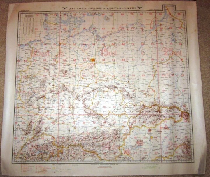You are bidding on a SUPERB example of a WW2 German Luftwaffe 1:2000000 Luftwaffe Luft-Navigationskarte in Mercator projection! Used for long-range aerial navigation and operational planning, these large-format air navigation maps were specifically produced for Luftwaffe flight crews and command navigation units. Measuring approx. 24β³ x 27β³ size, this example covers a broad region of Germany and surrounding areas and was intended for strategic aviation use rather than ground operations.Luftwaffe Luft-Navigationskarten of this type were issued under the authority of the Generalstab der Luftwaffe and utilized Mercator projection to assist with heading, distance calculation, and route planning over long distances. These maps were fundamental tools for bomber, transport, and reconnaissance units, providing standardized grid references, air navigation markings, and terrain features critical for wartime aerial operations. Issued examples like this were actively used throughout the early and mid-war period.Dated 1940, this map is printed on original wartime paper and remains fully readable and usable, with its original full-color printing intact. Condition is consistent with period military use and storage and may include fold lines, edge wear, minor tears, light staining, and handling marks. Not a modern reproduction or later reprint. The map retains clear color differentiation, legible text, and visible navigation and grid details. A VERY NICE and SCARCE addition to any Luftwaffe, aviation, or WW2 militaria collection!