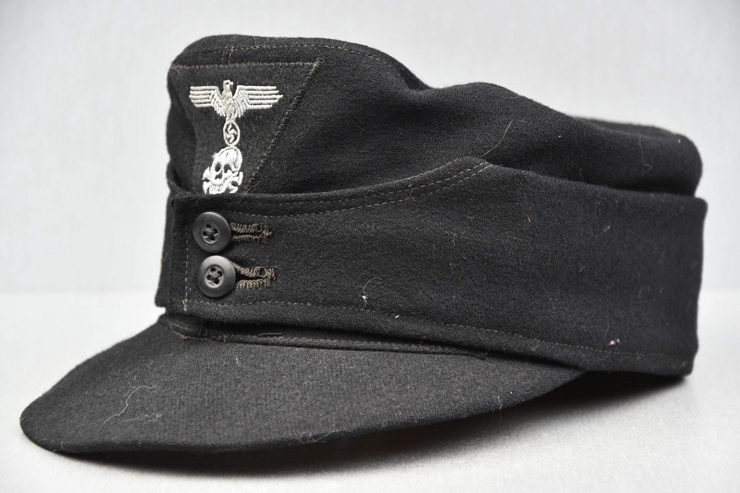 Original and textbook late war constructed M43 pattern Panzer cap for SS members. Late war example being a so called 'Dachau' (concentration camp) example, as these hats and many other clothing and badges were found there by American soldiers in 1945 and were taken back as war souvenirs. The cap has it's original SS panzer trapezoid insignia factory applied in zig-zag stitching on the front of the cap. This embroidered badge is also refered to as a pirate-trap because the skull has the same looks as a pirate flag. The interior is complete and shows a faded 59 size marking. The cardboard bill remains in good condition, and is folded in the middle as is was worn on a belt. A textbook late war cap!