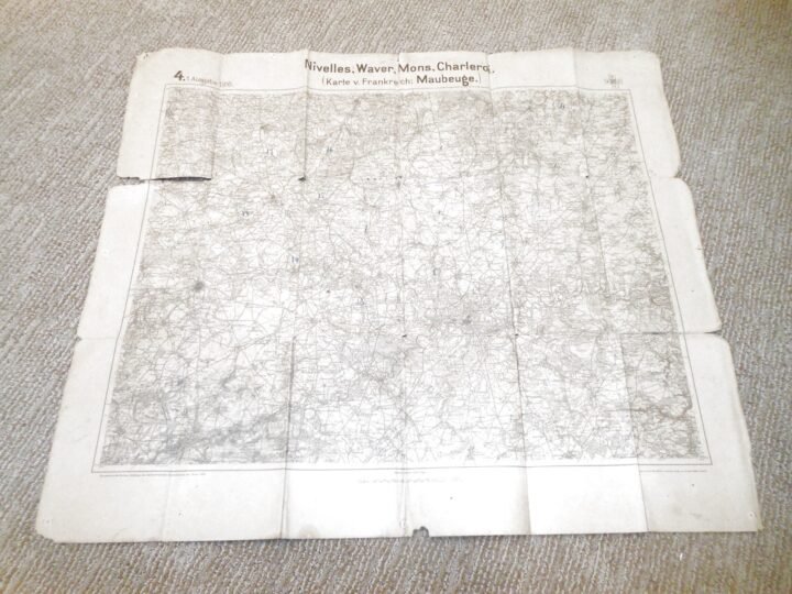 You are bidding on an original WW1 German / Prussian Military Field Map, dated 1916, and covering the regions of Nivelles, Waver, Mons, Charleroiβ¦including reference to the Maubeuge area. This is an authentic period-issued map produced for German army operational use during the First World War.During World War I, German military maps such as this were used by staff officers, artillery units, and field commanders for planning troop movements, coordinating rail and road networks, and establishing artillery reference points. Large-scale regional maps like this were especially important in Belgium and northern France, where fortified cities, rail hubs, and industrial centers played a critical strategic role throughout the war.Printed on heavy paper stock and is dated 1916, marked as a first edition issue. The map includes a printed scale bar and German-language legends, and shows highly detailed terrain, elevation contours, road and rail infrastructure, and populated areas. There are numerous period hand-drawn annotations present, including several numbered circled reference points, consistent with wartime tactical or artillery planning. Condition is FAIR to GOOD for its age, with multiple tears along fold lines, edge losses, small holes from period tack mounting, and general handling wear. A bit fragile in areas, due to the age. Despite the wear, the map remains structurally intact and historically significant, with all major geographic details clearly legible. PERFECT for any collection or display!