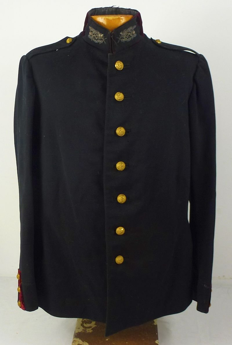 The tunic shows signs of age and wear, but it is without holes, damage or repairs. All of the gilt medical corps buttons are intact. The tunic is tailored in black wool with burgundy velvet collar and cuffs. The collar bears the French Army Medical Corps officer insignia in toned silver bullion. The top edge of the collar shows some fraying and a bit of separation between the lining and the collar. The collar has two hook and eye closures, missing one of the two hooks. The interior of the collar retains the woven tailor's label. Overall the tunic is in very good condition.