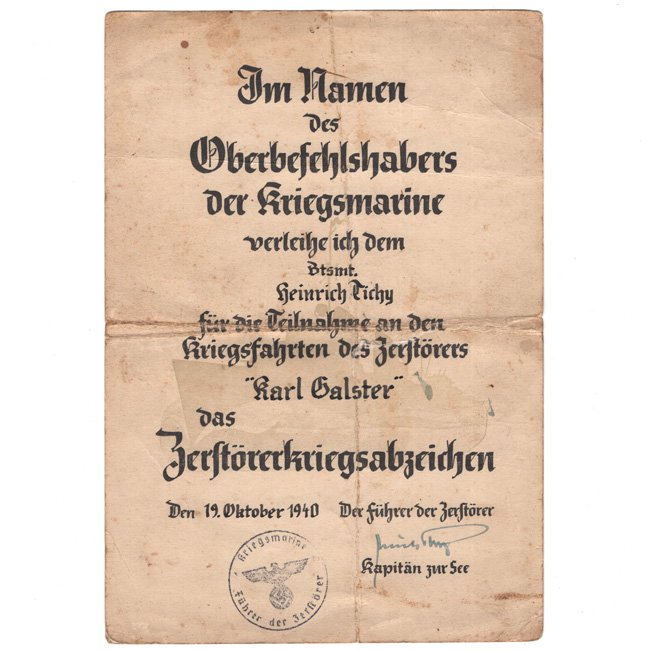 Kriegsmarine Destroyer War Badge (Zerstörerkriegsabzeichen) Award Document (Urkunde).