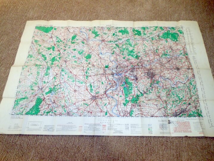 You are bidding on a VERY NICE example of a WW2 British War Office 1:100,000 Topographical Map! Used for operational overview, they offered a balance between regional coverage and tactical detail.This map is titled 'Essen', and and measures approx. 27β³ x 42β³ in size!British War Office maps of this type were produced for planning, navigation, and tactical coordination by Allied ground and air forces. Issued under General Staff (G.S.) designation, these maps were commonly used during the buildup and execution of operations in northwest Europe following the 1944 invasion, providing standardized terrain, infrastructure, and elevation data for operational use.Made of heavy paper, this map is in GOOD condition for its age. Dated 1944, it is printed on original wartime paper and remains fully readable and usable, with its original full-color printing intact. Condition is consistent with period military use and storage and may include fold lines, edge wear, minor tears, light staining, and handling marks. Not a modern reproduction or later reprint. The map retains clear color differentiation, legible text, and visible contour and grid details.A VERY RARE and FANTASTIC addition to any collection, display, or simply as a conversation piece!