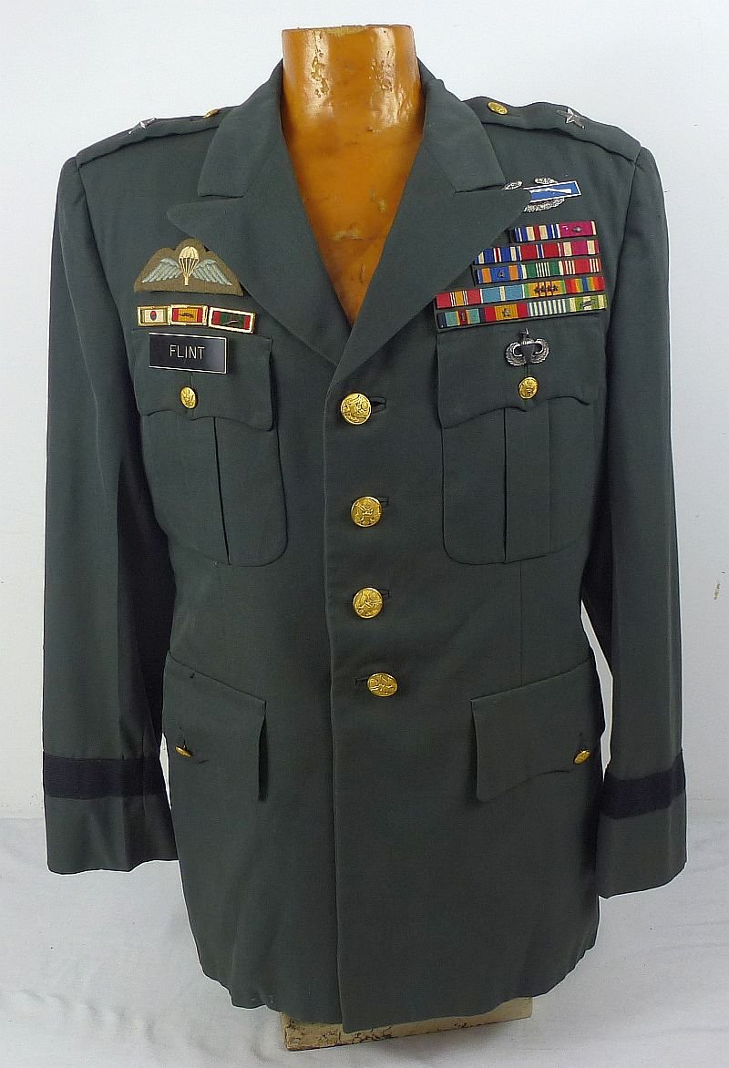 The tunic is in excellent condition, showing light wear and use. General Flint's career included service as a battalion commander of the 25th Infantry Division in Vietnam during the Tet Offensive. Other assignments included service with the 82nd Airborne Division, the United States Army Command and General Staff College, and the British Staff College at Camberley, and the United States Military Academy at West Point. He held a Ph. D. in history and was President of the Company of Military Historians. The tunic carries Flint's awards and qualification badges to include the Combat Infantry Badge; a Senior airborne paratrooper wing; and a British paratrooper wing. His ribbons reflect the award of the Silver Star, the Bronze Star; and the Vietnam Sevice Medal with four campaign stars.