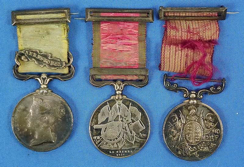 The group is comprised of the British Crimean War Medal, with 'Sebastopol' bar and intact pin back suspension bar, named to 'No. 1745. James. Young. The. Buffs'. The medal shows age and wear, with some edge pitting and uncleaned patina; the Turkish Crimea Medal, with pin back suspension bar, named to 'James Young 1745 3rd Regt.', with the medal exhibiting wear, some edge pitting, and an uncleaned patina, with the ribbon showing wear; and the Long Service and Good Conduct Medal, named to '1745. J. Young. 1st Btn. 3rd Regt.', with the medal having the pin back suspension bar, and with the medal showing age and uncleaned patina. The ribbon is separated from the medal suspension. Overall the group of medals is in very good condition.