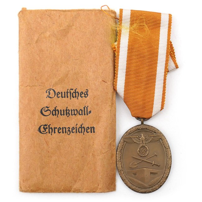 Westwall Medal (Deutsches Schutzwall-Ehrenzeichen). The Westwall medal was instituted by Adolf Hitler on 2 August 1939 for military personnel, and civilian employees, who assisted in the planning and construction or defence of the German fortifications on the western border of Germany. The medal is a tombak (Buntmetall) example, complete with its original ribbon. The medail comes with its original pouch of issue, maker marked by the company of 'Hymmen & Co' from Lüdenscheid. Nice set in good condition!