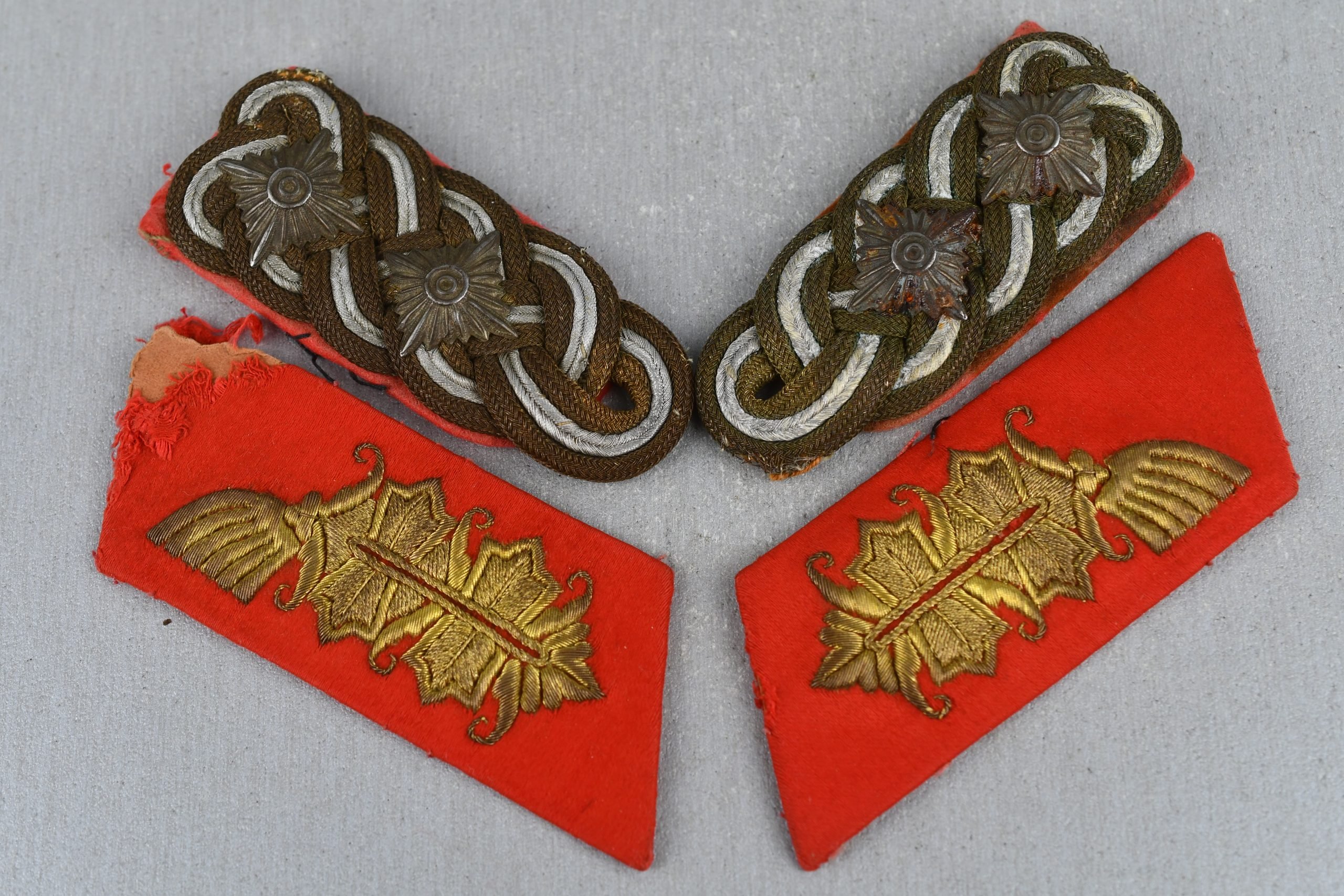 An outstanding and fully original attributed insignia group consisting of collar tabs and shoulder boards belonging toGünther Blumentritt, who served as General der Infanterie in the German Army and was a recipient of the Knight's Cross of the Iron Cross with Oak Leaves.This matching set comprises:A pair of General's collar tabs, constructed on red wool backing with finely hand-embroidered gold bullion oak leaves and wings, showing correct wartime materials and workmanship.A pair of General der Infanterie shoulder boards, featuring interwoven gold and silver bullion cords on red underlay, each fitted with two general's rank stars, correctly denoting the rank of full General.All components are clearly period-worn and uniform-removed, with visible stitch holes, original attachment threads, and wear patterns consistent with prolonged service use. The reverse sides display hand-sewn construction, field tailoring characteristics, and age-related staining, leaving no doubt as to their originality. These are genuine veteran-used insignia, not later-assembled or collector-enhanced pieces.The group was obtained via an intermediary directly from the Blumentritt family, providing highly desirable provenance. Günther Blumentritt was a senior and respected Wehrmacht officer, serving notably as Chief of Staff to Field Marshal von Rundstedt and later as a corps commander on the Western Front. His award of the Knight's Cross with Oak Leaves places him among a select group of highly decorated German generals, significantly enhancing the historical importance of this insignia set.