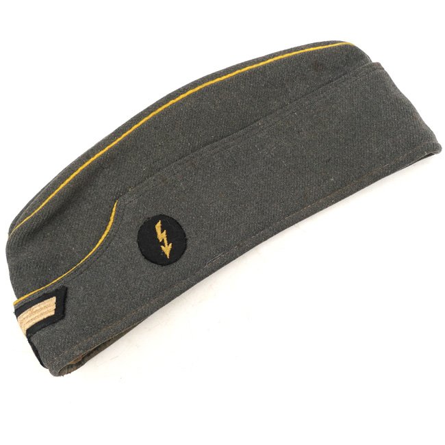 Female Signal Auxiliaries Overseas Cap (Schiffchen einer Nachrichtenhelferin des Heeres). The Female Signals Auxiliary Corps (Nachrichtenhelferinnen des Heeres) were organized in a military system and were tasked with all aspects of communications within the occupied countries and in certain military communications centers within Germany that required special security that was unsuitable for civilian personnel. Personnel serving with the Female Signals Auxiliary Corps were outfitted with special uniforms and insignia, including the female signal auxiliaries overseas cap. The cap-eagle is neatly handstitched to the cap, this is a special Helferin type cap-eagle on a black backround. A signal blitz is attached to the left-side of the cap, embroidered in yellow on a dark-green background. The cap is piped in the yellow branch colour. The cap is having tan coloured cotton lining material and is nicely size '56' marked and named to Helferin 'E. Wendt'. The cap shows normal traces of usage and wear, see photos. Scarce original female signal auxiliaries overseas cap!