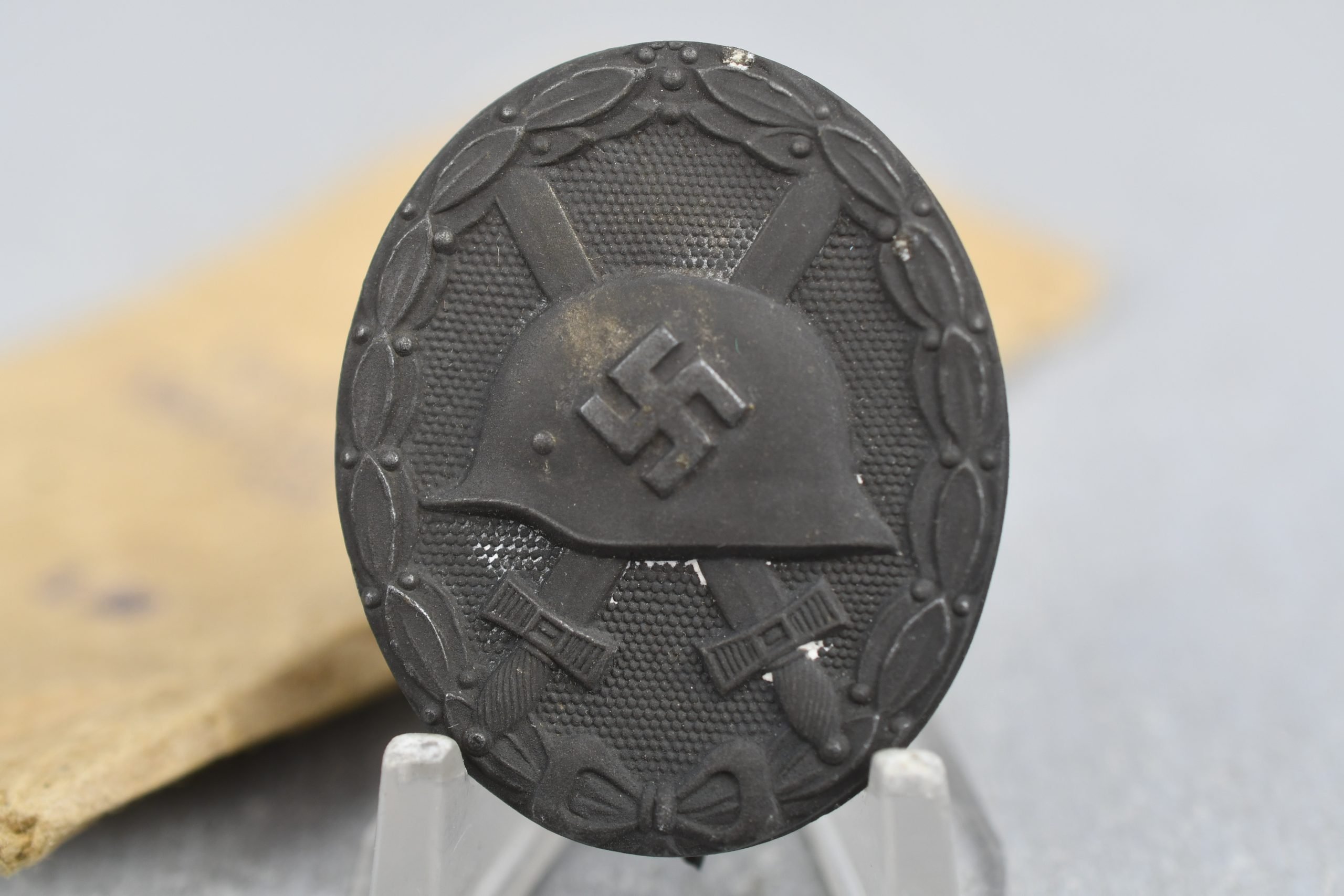 Nicely worn Wehrmacht silver wound badge. Maker marked on the reverse with L22, which is the code of the firm of Glaser & Söhne in Dresden. Comes with its original award envelope marked L22 on the front. The package is marked by Souval on the back who probably provided materials to this partifuclar manufacturer.