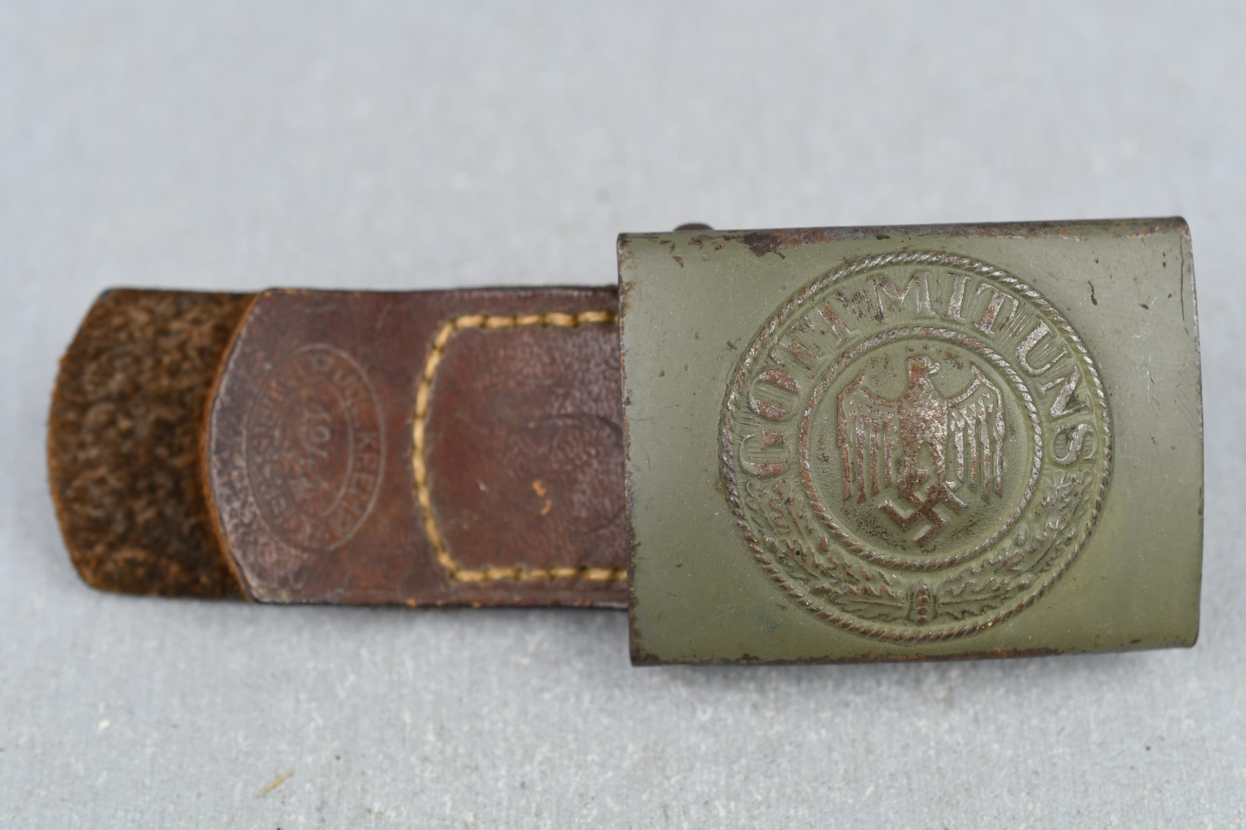 Light worn steel exectued army belt buckle. Maker marked on the reverse by IKA41 which matches with the maker mark on the leather tab from Julius Kremp, Lüdenscheid dated 1941.