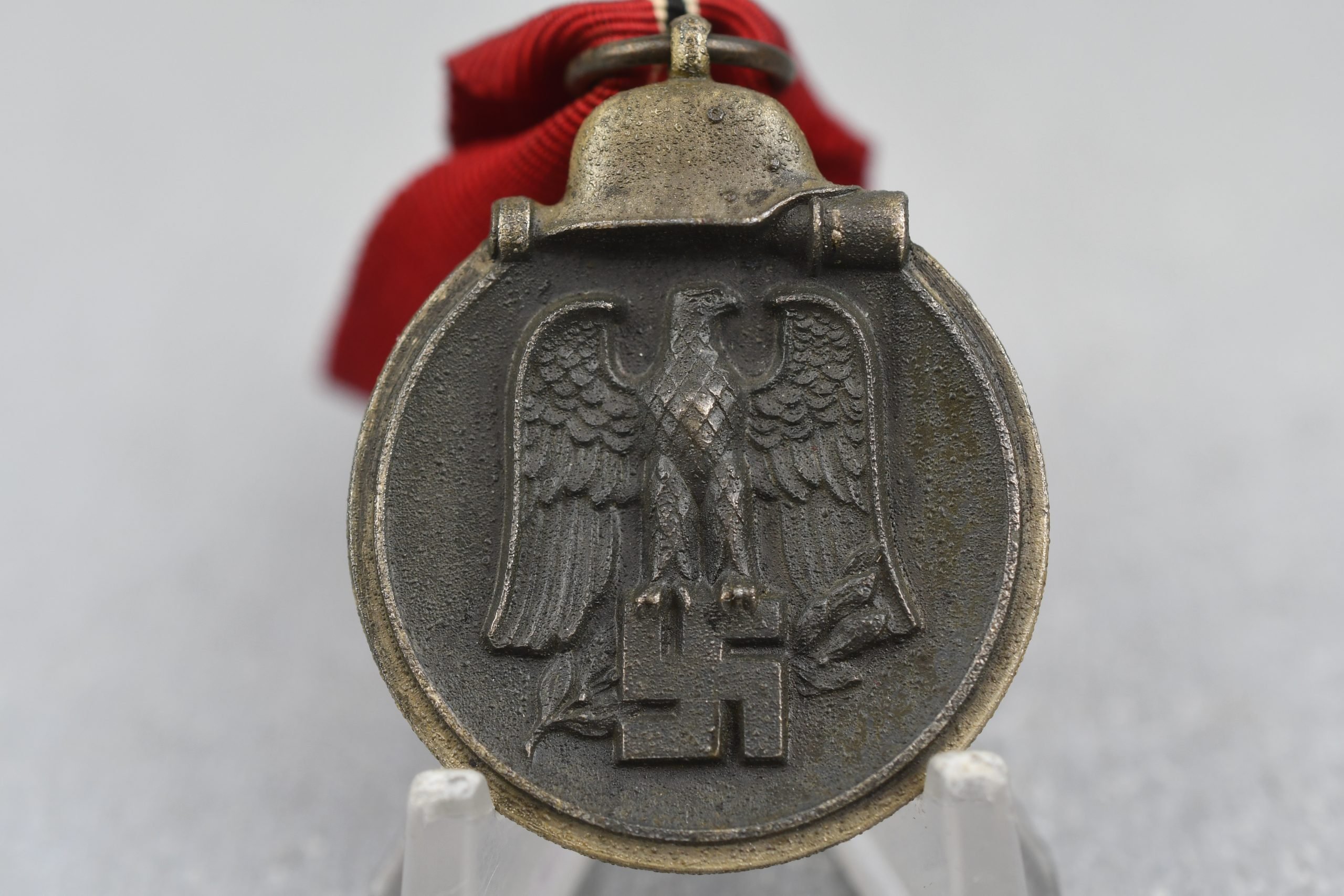 Zinc constructed medal with ribbon in very good condition. Maker marked in the ring by '100′ Wächtler & Lange, Mittweida.The Eastern Medal was awarded to any member of the Wehrmacht and Waffen-SS in recognition of probation in the struggle against the Bolshevik enemy and the Russian winter within the period from 15 November 1941 to 15 April 1942. It was also awarded posthumously to any service member who died in the line of duty within the Soviet Union.
