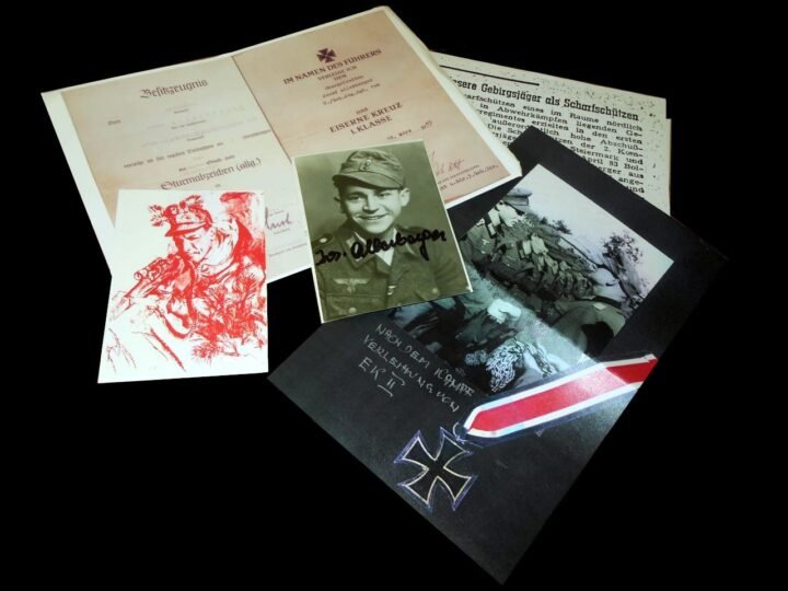 You are bidding on a VERY NICE original post-war autographed photo grouping relating to WW2 German Wehrmacht Heer Sniper Josef 'Sepp' Allerberger! The primary item in this lot is a period post-war photographic portrait bearing Allerberger's original autograph on the front, with an additional pencil signature on the reverse.Josef 'Sepp' Allerberger was one of the most well-known German snipers of World War II, serving with the 3. Gebirgs-Division (3rd Mountain Division) on the Eastern Front. Allerberger was awarded the Knight's Cross of the Iron Cross in April 1945. Following the war, he became widely known through veteran accounts and later publications, including his autobiographical recollections, which contributed significantly to the historical record of sniper operations on the Eastern Front.Made of paper, this grouping includes the autographed photograph described above along with accompanying post-war reference materials and documentary paper items, including printed biographical summaries and reproduced award documentation. These accompanying items are post-war copies and informational materials intended for historical reference and context. Condition overall is NICE, with expected light handling wear to the paper items. The autographed photograph remains intact, with no tears and only minor age-related wear consistent with post-war handling. A solid veteran autographed grouping centered on a well-known and highly collected German snipery!