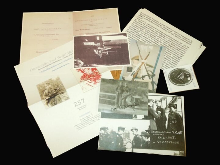 You are bidding on a VERY NICE original post-war autographed photo grouping relating to WW2 German Wehrmacht Heer Sniper Josef 'Sepp' Allerberger! The primary item in this lot is a period post-war photographic portrait bearing Allerberger's original autograph on the front, with an additional pencil signature on the reverse.Josef 'Sepp' Allerberger was one of the most well-known German snipers of World War II, serving with the 3. Gebirgs-Division (3rd Mountain Division) on the Eastern Front. Allerberger was awarded the Knight's Cross of the Iron Cross in April 1945. Following the war, he became widely known through veteran accounts and later publications, including his autobiographical recollections, which contributed significantly to the historical record of sniper operations on the Eastern Front.Made of paper, this grouping includes the autographed photograph described above along with accompanying post-war reference materials and documentary paper items, including printed biographical summaries and reproduced award documentation. These accompanying items are post-war copies and informational materials intended for historical reference and context. Condition overall is NICE, with expected light handling wear to the paper items. The autographed photograph remains intact, with no tears and only minor age-related wear consistent with post-war handling. A solid veteran autographed grouping centered on a well-known and highly collected German snipery!