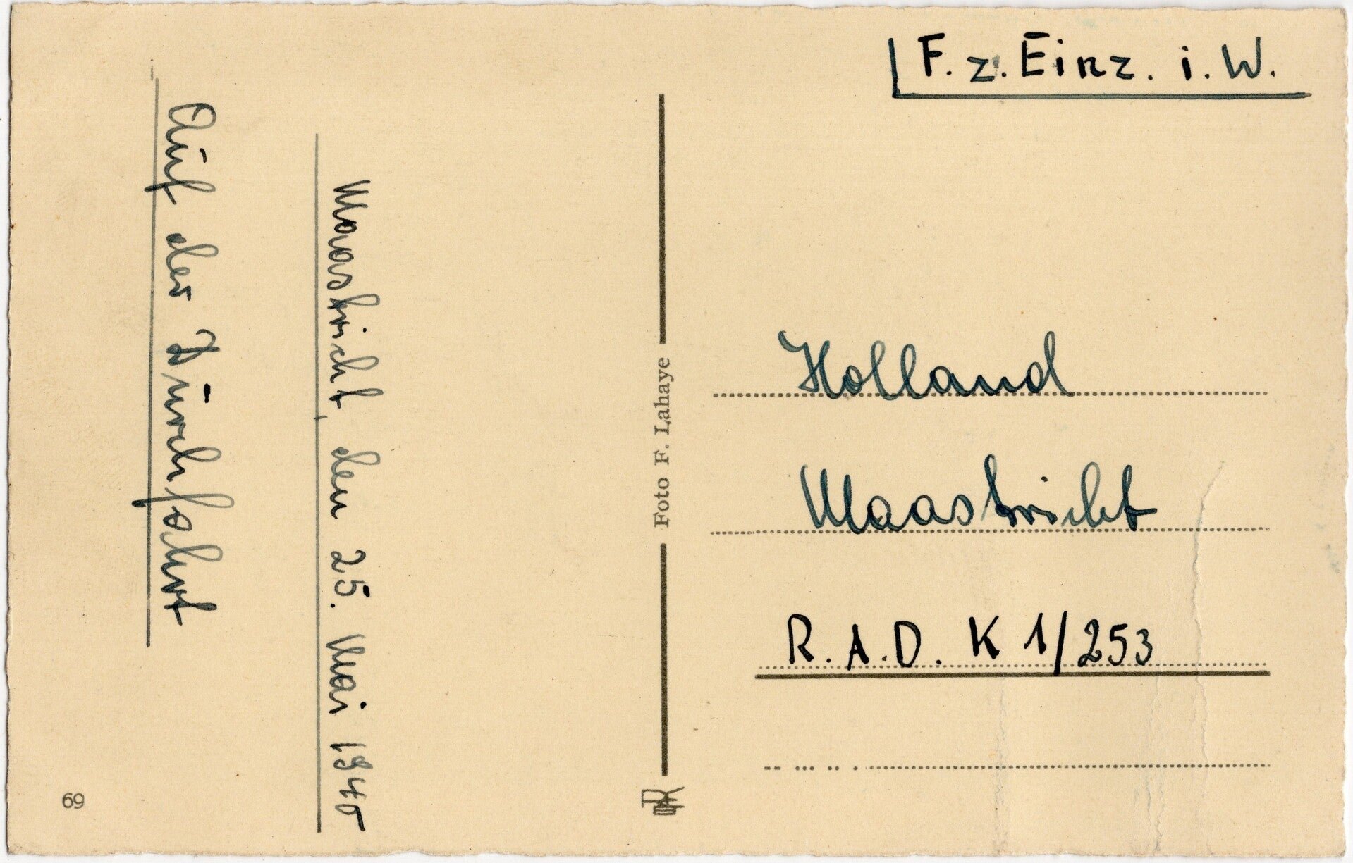 Original Dutch WW2 Postcard - German Feldpost RAD K1/251 Maastricht (1940)Originele Wo2 Nederlandse Postkaart - Duitse Feldpost RAD K1/251 Maastricht (1940)