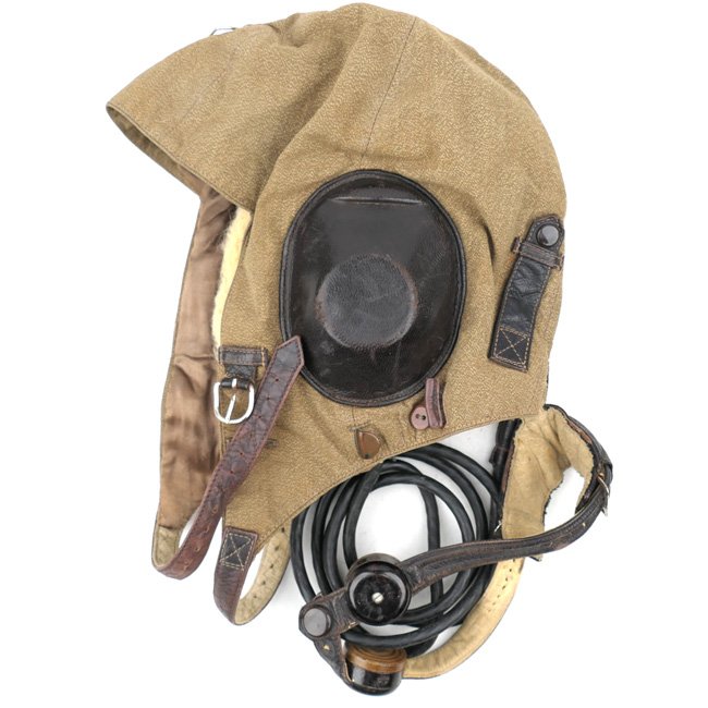 Luftwaffe 'LKpS101' Summer Flight Helmet (Fliegerkopfhaube für Sommer mit FT-Gerät). The 'LKpS101' Summer Flight Helmet model flight helmet was designed for summer wear and was outfitted with radio equipment as used by fighter pilots and bomber commanders, these were mostly used by fighter pilots. Blackened leather and tan coloured 'salt & pepper' linen construction flight helmet with steel fittings. The interior of the helmet is lined with brown/green rayon. The cap is complete with integral communications equipment and original long type wire but unfortunately missing its original bakelite plug. The cap is complete with label and maker marked with manufacturer's code 'bxo' which is indicating production by the 'Deutsche Telefonwerke u. Kabelindustrie A.G.' from Berlin, the cap is size '59' marked. The cap shows normal period wear and usage, see photos. Nice and hard to find original Summer Flight Helmet in good used condition!
