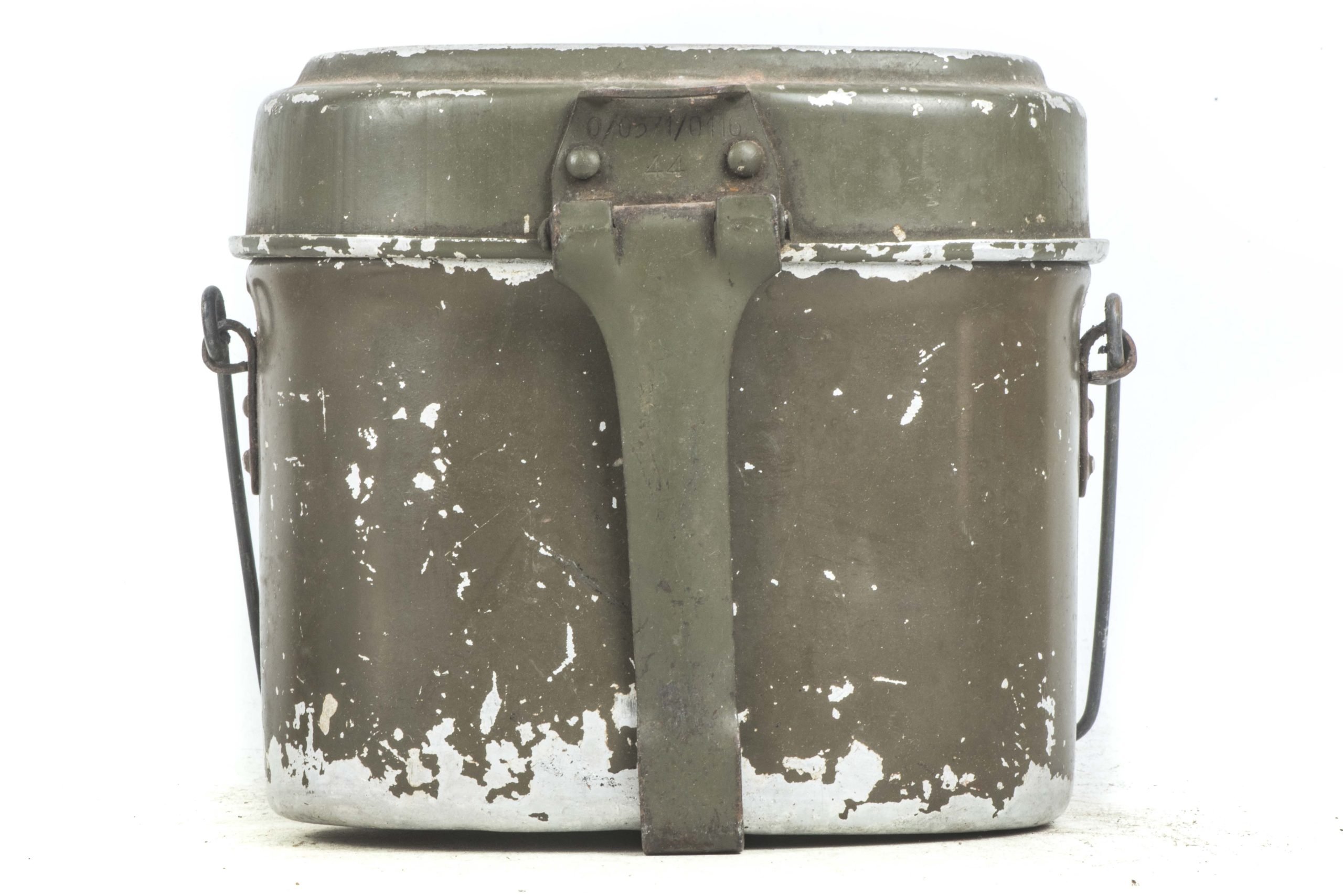 Late war produced M31 mess kit or'Kochgeschirre M 31 (Alum.)'in excellent condition. This is a so-called transitional M31 variant mess kit: manufactured out of aluminium (M31) with simplified steel hooks as introduced with the M42 mess kit! The mess kit is nicely marked0/0571/0116 44which indicates production byOtto Honsel-Werke, Aluminiumwerk, Werdohlin late 1944! Note that the handle of the lid does not have the loop for the equipment strap. Rare RBNr. marked mess kit in used condition!