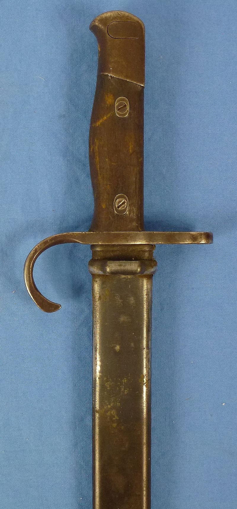 The bayonet has a bird head pommel and a hooked quillon. The blade exhibits age, with spots and surface grime, but overall it is generally clean and without nicks, chips or active rust. The ricasso bears the mark of the Kokura Arsenal. The contoured wood grip plates have signs of age and use, but without chips or cracks. The guard and the pommel retain much of the dark finish, as doess the scabbard. Overall good field used condition.