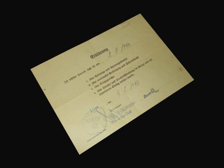 WW2 German Wehrmacht Erklärung – DECLARATION FORM – Legal Acknowledgement 1943