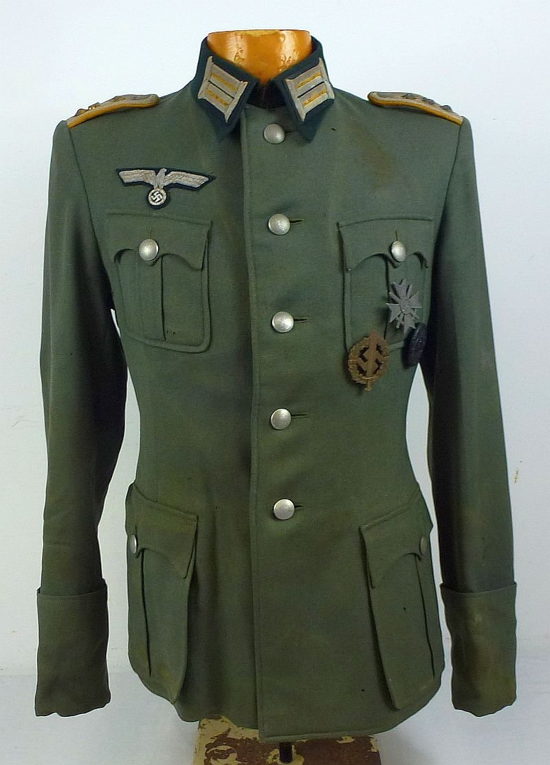 The well worn tunic was tailored in a high quality field gray wool blend material by a Potsdam military tailor. The upper right breast displays a bullion Army eagle, while the collar bears the tabs of a cavalry officer. The shoulders display the rank boars of a Hauptmann of the 15th Cavalry Regiment. The interior pocket retains the tailor label, dated in 1940 and named to 'Wachtm(eister) Cadenbach', reflecting that, over the course of the war, the owner of the tunic rose from the rank of a senior non-commissioned officer to the rank of Captain. The interior collar bears the woven label of the same Potsdam tailor, which is rather tattered from wear. On the lower left breast are decorations which include the War Merit Cross First Class with Swords. The cross is a zinc alloy screw back example, marked 'L/58', reflecting production by the firm of Glaser & Sohn of Dresden. Beneath the decoration are loops for the wear of a pin back badge. Also on the tunic is a 1939 black Wound Badge, in excellent condition, affixed to two thread loops. The tunic also has a bronze SA Sports Badge, maker marked by Sieper & Sohne, and also affixed to two thread loops. The tunic was clearly worn in the field of operations, with the tunic having surface soiling and a few small holes, as well as age toning of the collar tabs and shoulder boards. Additionally, the undersides of the forearms on each sleeve have very well tailored heart shaped patches in matching field gray material. The tunic shows operational wear and use, but it exhibits great character and it makes an overall very good appearance.