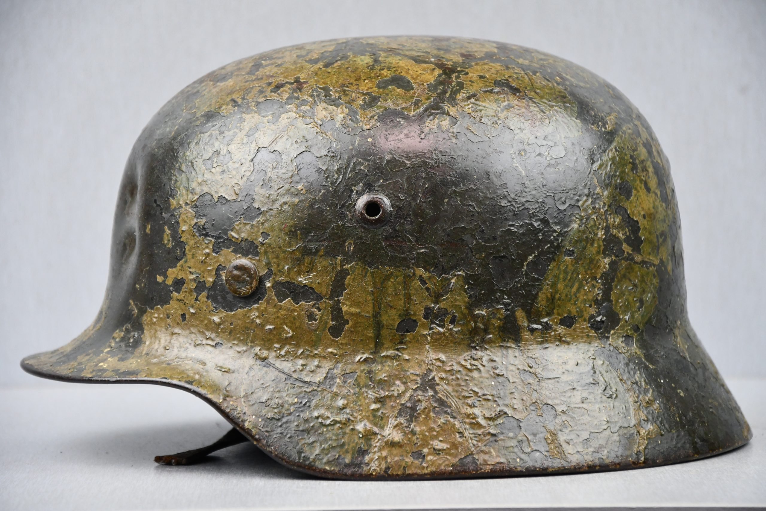 M35 steel helmet that started it's life as a double decal example in glossy blue paint. Got camouflaged during the war, covering both decals. The camouflage pattern is a classic 'Normandy' three tone spectrum period applied using saw dust mixed paint. The colors shows wear and combat damages. The exterior has a layer of varnish to avoid the paint from falling off. The inside remains perfect and untouched having a single band aluminum liner dated 1937. The leather is a bit stiff but remains strong. The (broken) chin strap is still present. The split pins remain straight and untouched. Maker and size marked shell: Q64 lot number 311. Named to Uffz. Balzer. Been there three tone camouflage helmet!