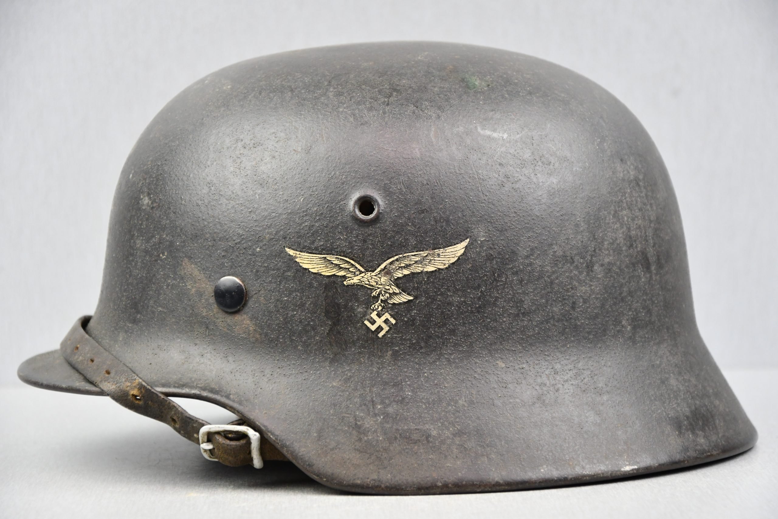 Light worn M40 Luftwaffe helmet in good condition. The Luftwaffe decal on the left shows minimal wear and scratches and remains present for over 95%. The exterior blue paint still looks bright and shows normal wear. Complete original liner, shows normal wear and small damages. Draw string and chin strap are present. The strap has been period shortened for more comfort, as often oberserved. Two split pins in the front are original but replaced. The rear one is still part of this helmet. Therefor the liner could have been changed at one point in time. Helmet liner band is dated 1940. Maker marked shell by E.T. size 66, lot number 1171. A honest and worn Luftwaffe combat helmet!
