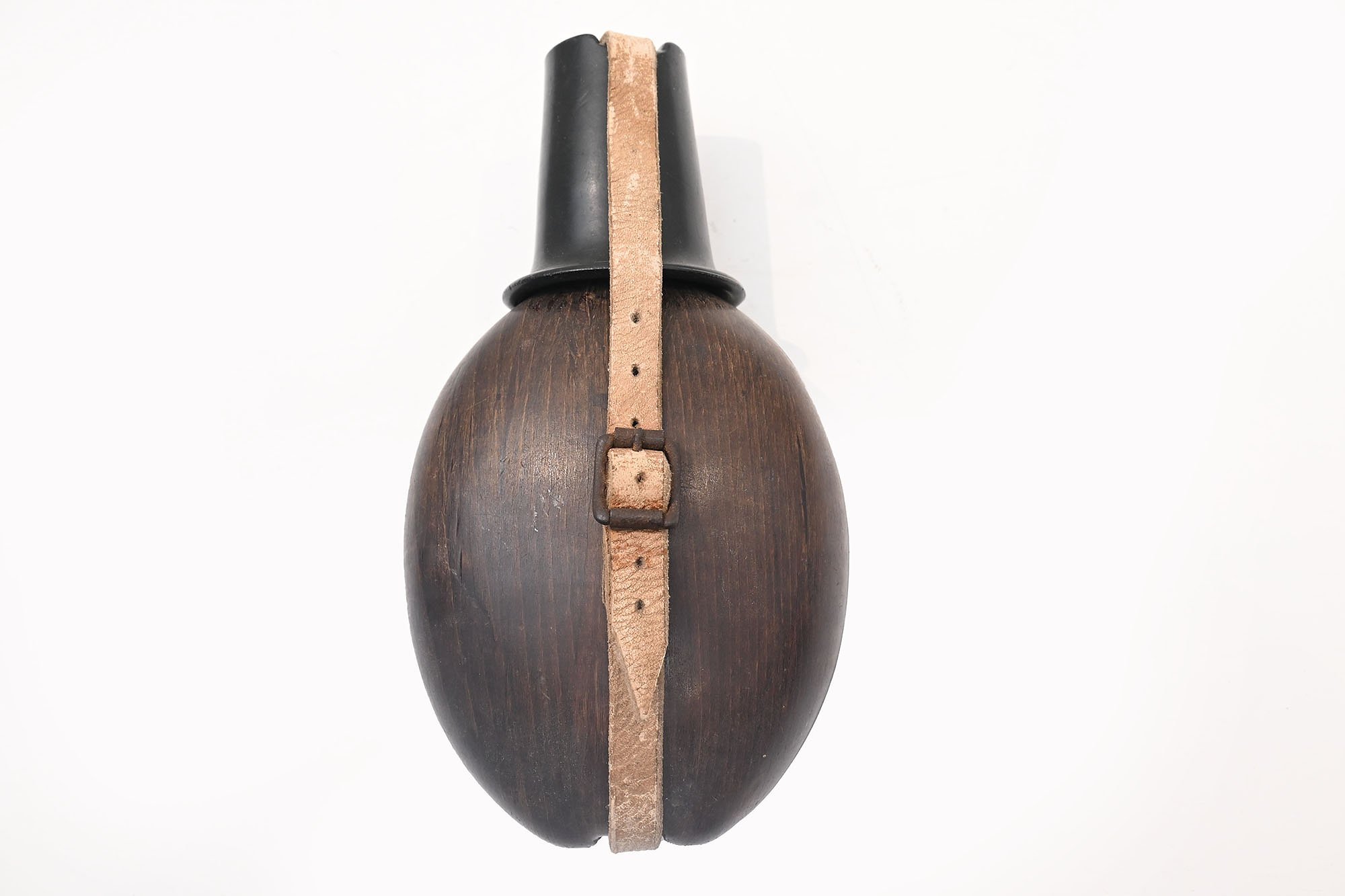 A neat coconut water bottle with a Bakelite cup and a strange leather strap...possibly made of buckskin, which can be seen from the English ring on top of the bottle.cup is intact and the leather is still in good condition.