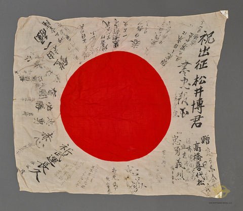 Japanese WWII 'Hinomaru'Good Luck Meatball Kanji Flag- This flag is made of soft bunting cotton like material and shows the printed red sun on the field of white. There is kanji printed in black ink all around the white field. These Yosegaki Hinomaru were a traditional gift for Japanese servicemen deployed during the military campaigns of the Empire of Japan, most notably during World War II. The flag was typically a national flag signed by friends and family, often with short messages wishing the soldier victory, safety and good luck. This flag measures 31 inches (79cm) by 28 inches (71cm). There is minordiscoloration. In very good condition.Desirable flag!