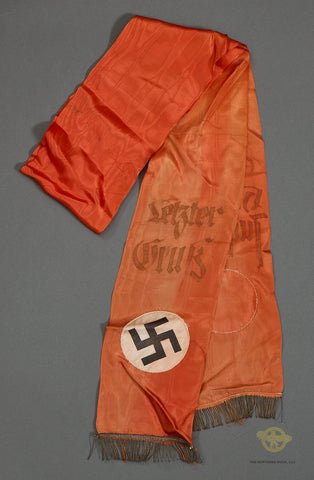 German WWII Funeral Sash for a Hitler Youth Official- This is a red satin funeral sash that measures 74 inches (188cm) in length and 6 inches (15cm) in width. There is a gold bullion fringe on each end of this sash. There are two applique patches on the ends of this sash; both are a black, printed swastika on a white satin disc. The script on the sash has faded over time. This would have been displayed at a Hitler Youth official's funeral. This sash is slightly faded with some staining. The bullion fringe is still in very goodcondition.Displays well and complete.