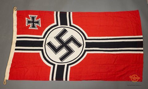 German WWII Battle Flag as Used by Army, Luftwaffe and SS -Desirable smaller flag great for display! This two sided battle flag measuring 66 inches (170cm) long and 35 inches wide (100cm). This example is produced in red bunting. This is maker marked and stamped in black ink with the makers information and made in Helmond (Holland). It is also stamped in black ink on the other side of the hoist end, Kr. Fl. 100x170. It does have its rope lanyard for hoisting, with bothends having the rope loop. Very vibrant colors and no holes or tears.The flag is in excellent choice condition. A Very handsome battle flag.