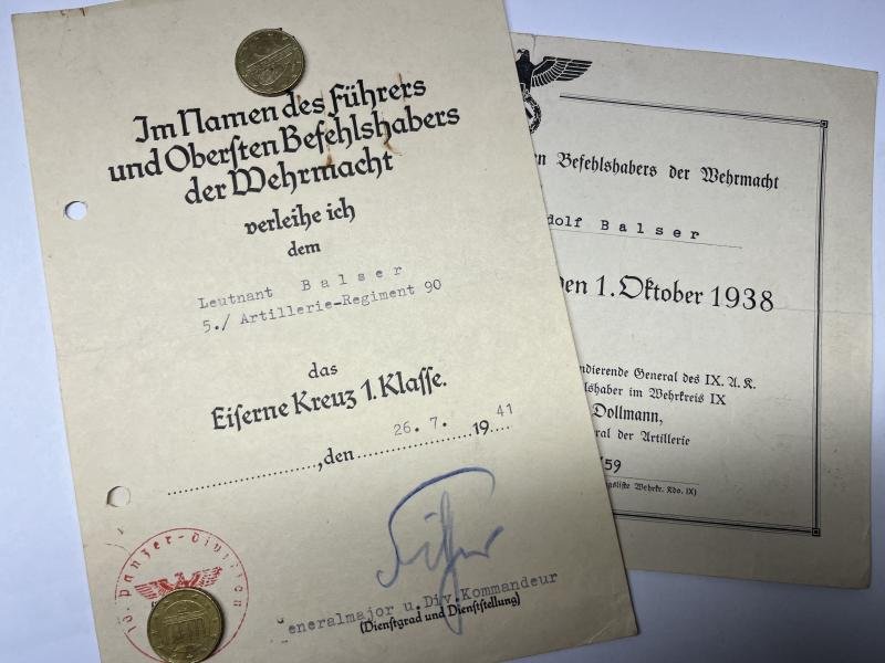Citation set of 'Leutnant' Rudolf Balser who served within Art.Rgt.90 of the 10.Pz.Div.1) 'Medaille zur Erinnerung an den 1-10-1938' citation which has been signed by the commanding officer.2) EK I citation which has been signed by 'Generalmajor' and divisional commander Wolfgang Fischer (RK 29-5-1940,DKiG 22-4-1942,EL 9-12-1942) !!!Fischer was KIA on 5-2-1943 at the Mareth (Tunisia) stronghold.