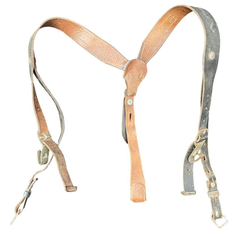 Original Black leather German army Y straps. In very good condition overall. This particular example appears to have seen only minimal use. Correct hooks and hardware. Some minor pitting to the metal, likely from cold storage.