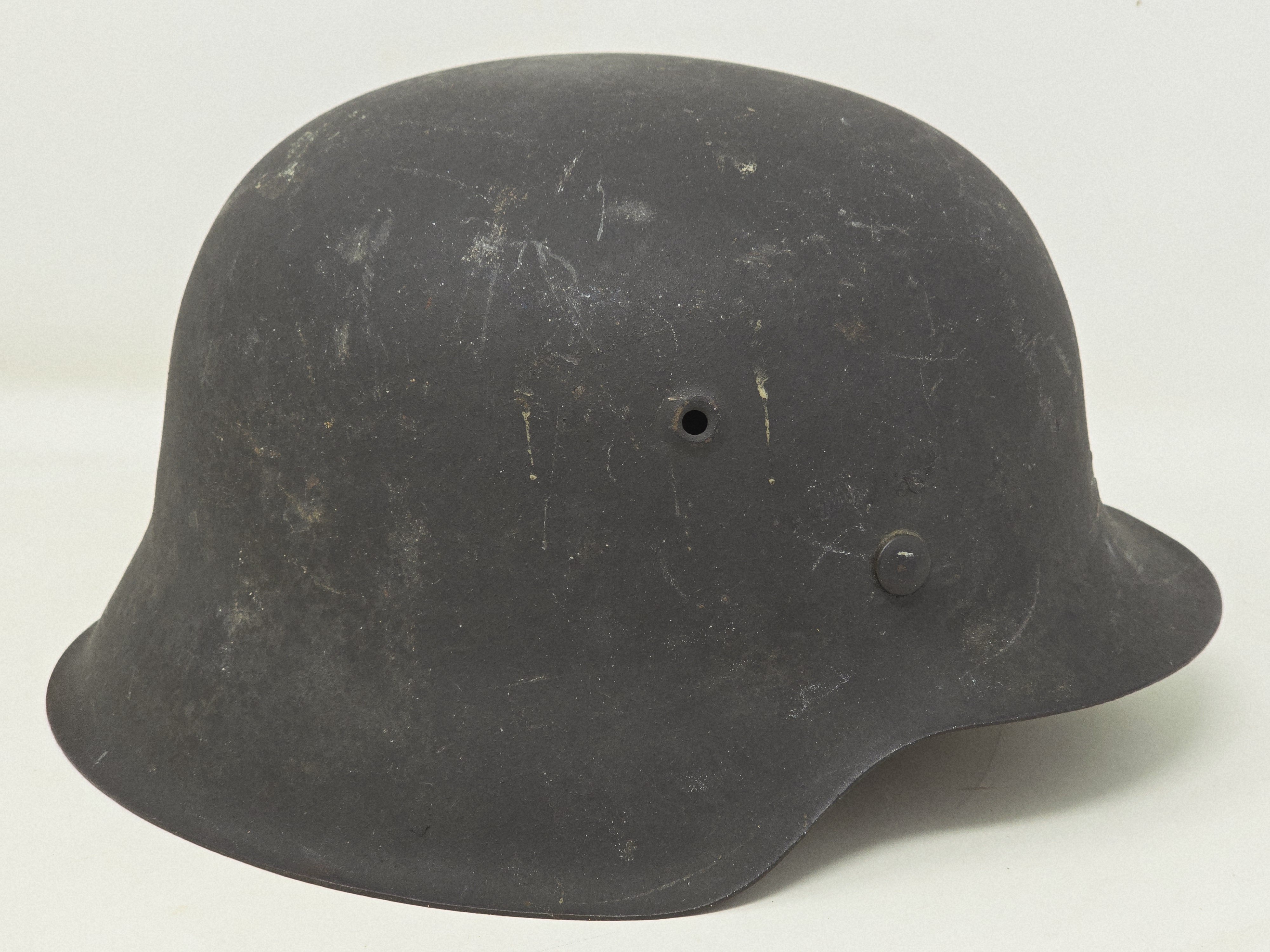 This helmet basically is an unissued CKL size 64, heat lot number #4881. The liner is blonde and is stamped size 56. There is a tiny bit of age showing at the edge of the liner. The chin strap is RB Numbered. Overall, the helmet shows no service wear, just storage condition. A fine addition to the German helmet collection. COA accompanies.