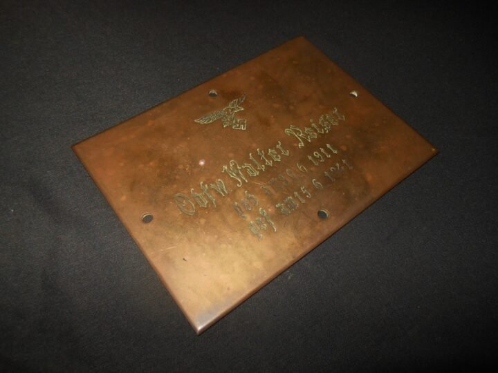 You are bidding on a VERY NICE original WW2 German Luftwaffe Brass Memorial Plaque, commemorating Oberfeldwebel Walter Reiser, who was killed in action in 1941, when his Fw200 crashed over Portugal.Oberfeldwebel Walter Reiser served as a crew member aboard a Focke-Wulf Fw 200 C-3 Condor involved in anti-shipping operations. In the early hours of 15 June 1941, the aircraft was returning from an attack on a naval convoy west of Gibraltar when it was struck by flak and subsequently suffered a catastrophic failure. There are news cuttings of the time referring to a combat between a RAF Catalina and four German airplanes. The pilot was probably searching for a place to land and Amareleja had a landing strip at the time, but one bomb failed to release and detonated mid-flight, causing the aircraft to explode. Wreckage was scattered across approximately three kilometres, and all six crew members were killed.The bodies were collected by the Beja Fire Brigade and transported to Moura where they received proper military honors before being buried in the local cemetery, where they still are.The plaques offered from this group commemorate four of those lost in the incident, and came from the original monument, which has been updated and restored.Made of solid brass, this item is in SUPERB condition! Some slight toning, oxidation, spotting, and surface wear consistent with period brass. The engraving remains clear and legible. All mounting holes are present and untouched. Measures approx 4β³ x 6β³ in size, with Gothic script with full birth and death dates, surmounted by a Luftwaffe eagle. The plaque has four original mounting holes, indicating it was intended for permanent display, likely as part of a unit or memorial installation. A scarce and sobering original Luftwaffe memorial item directly linked to a documented combat loss of a Fw200 Condor in 1941. An EXCELLENT addition to any collection or display!