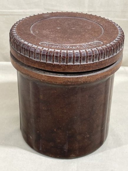 Used 100% original Bakelite container with screw-on lid. The container is very well marked and the top and bottom match. The size is approx. 6 inches in diameter and 6.5 inches tall.