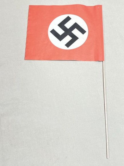 Unused 100% original paper Nazi flag on a wooden dowel. The flag has been rolled. The flag size is approx. 8.25 x 6.75 inches.