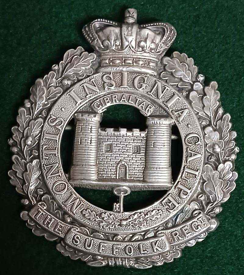 .VOLUNTEERS BATTALIONSuffolk Regiment Victorian O/R's Pagri badgeLarge ( 65mm ), Victorian, die struck white metal Suffolk Regt. o/r's pagri badge for wear on the foreign service helmet. Stout pin to reverse.Less than 600 Volunteer troops sent to the Boer war.