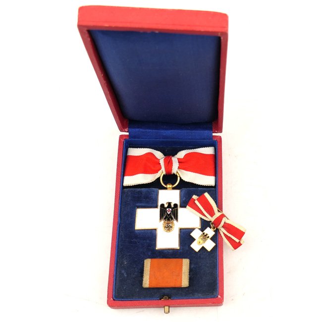 German Red Cross Cross of Honour 2nd Class for Women (Ehrenzeichen vom Deutschen Roten 2. Klasse), 1937-1939. The 1937-1939 DRK awards recognized loyal service in the DRK. On 1 May 1939, Hitler introduced a series of four Social Welfare awards to replace the earlier DRK (Deutsche Rotes Kreuz) awards. All enamel of the cross is intact and showing only minimal traces of usage, the details on the piece are really pronounced and stunning. The cross is period mounted on a ribbon for women, complete with safety-pin to the reverse. The cross is complete with matching miniature cross, the set is stored in their original red coloured case as found together. The set is not visible maker marked. Stunning and extremely rare original set in very good condition!
