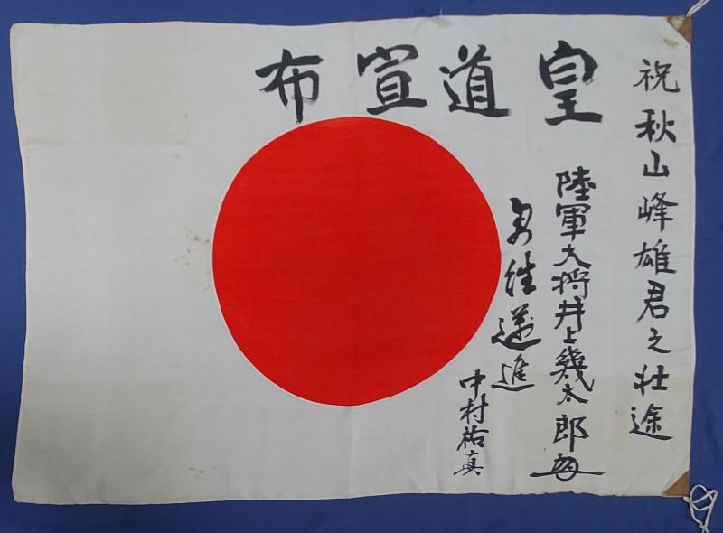 Silk flag measuring 27 X 39-1/2 inches showing a few stains and some edge wear.He was the first chief of the Army Aviation Department, a role in which he helped establish and develop Japan's military air power andalso served as the chairman of the Imperial Military Reservist Association.