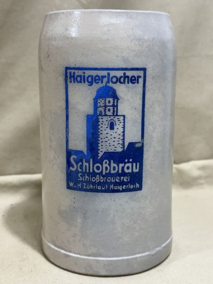 Nice crockery style mug for the Haigerlocher Schloþbr‰u Brewery. This one has minor manufacturing defects only. This came out of an attic where they had been for decades. It is the 0.8 liter size. YOU WILL RECEIVE THE EXACT STEIN PICTURED.