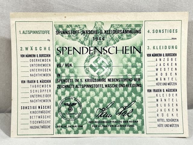 Original WWII German Clothing Donation Form, SPENDENSCHEIN