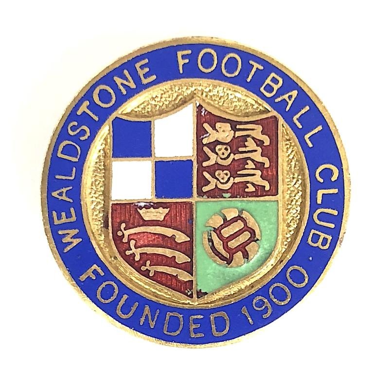 A scarce original pre 1960's period 'Wealdstone Football Club supporters buttonhole lapel badge'; gilt brass circular blue enamel title surround, the central clubs highly enamelled embossed quartered shield representing thier blue and white colours, three lions for England, three swords for the County of Middlesex and a football. Very good condition, complete with original buttonhole lapel fitting, no stress marks or enamel loss, an excellent example.Diameter approx 26mm.