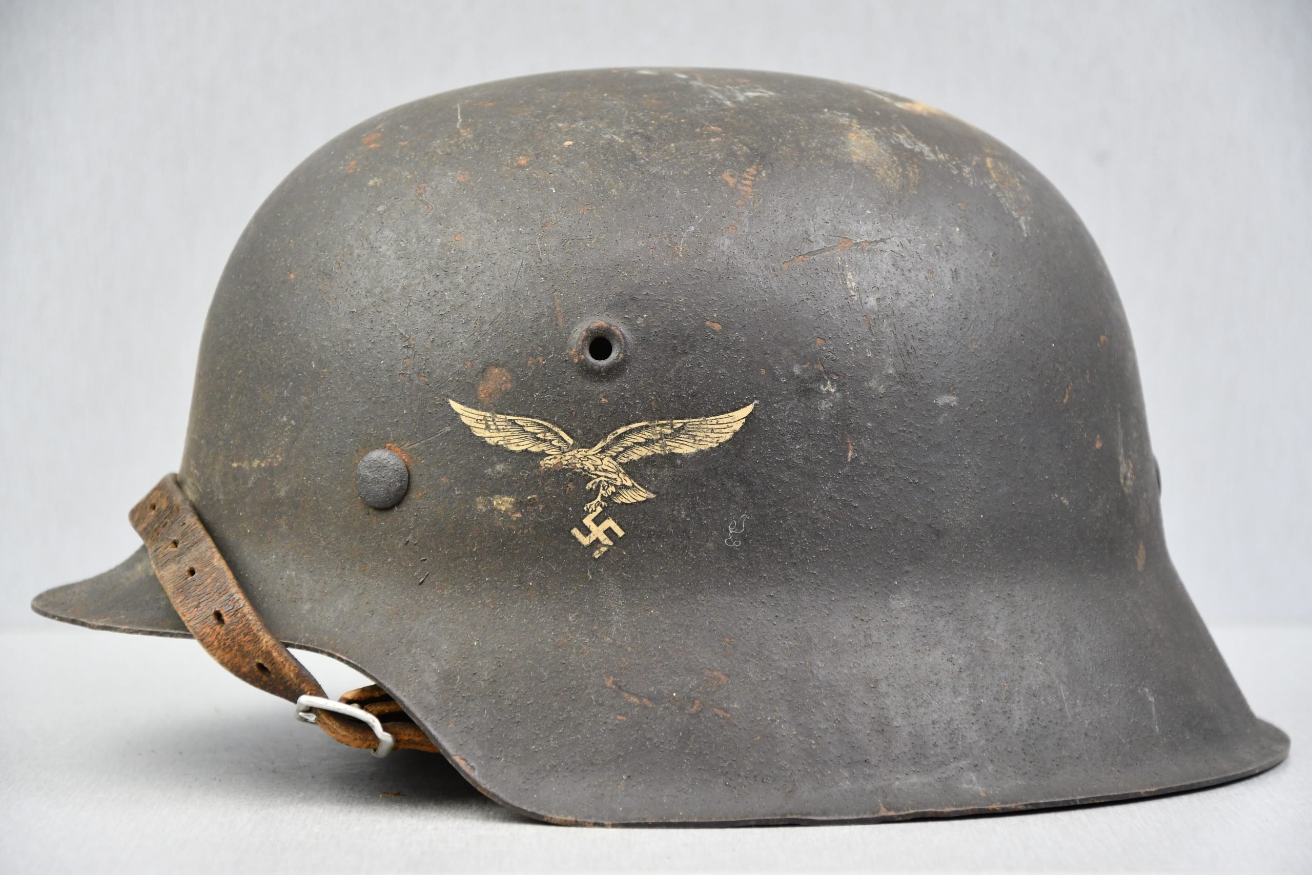 Standard M42 Luftwaffe helmet in light worn condition. The decal remains in very good condition showing sharp details. Steel liner band sits firmly in place and pins remain untouched. Leather is supple and strong, shows wear and damages on the top rim. Draw string is original. Complete with full length chin strap. Maker and size marked ET64 and lot number 2005. Just an honest been there helmet!