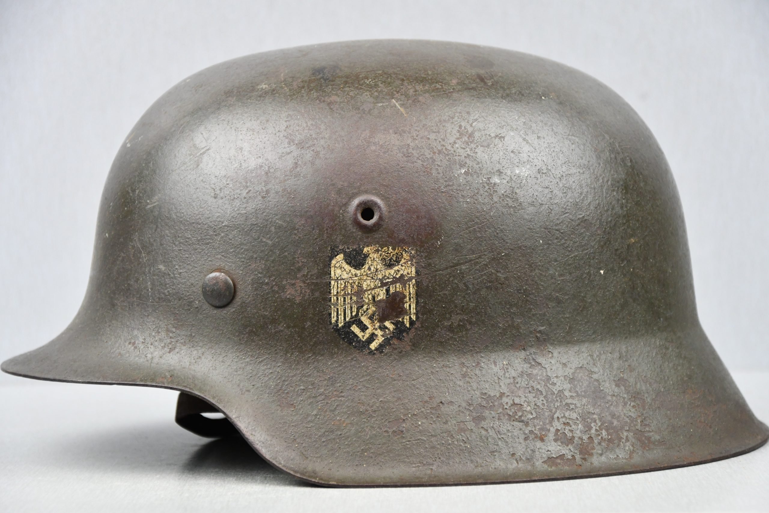 Large M42 pattern steel helmet with an army decal (ET-pattern) on the left side. The decal is original to the helmet. Complete original liner in good condition. Draw string and period shortened chin strap are present. The split pins remain straight and unmessed with. Maker marked by ET, size 68. Lot number 2160. A very honest untouched M42 army helmet hard to find in this size 68!